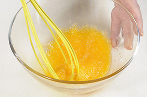 Comece pelo pudim: Misture muito bem com um fouet o ovo ao açúcar e adicione o leite.