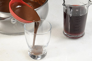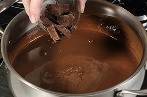 Quando começar a levantar bolhas, retire do fogo adicione o chocolate amargo picado, a glucose de milho, a baunilha e a manteiga. Mexa bem até dissolver todo o chocolate.