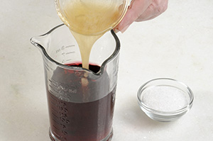 Acrescente a gelatina já dissolvida ao vinho e açúcar. Misture bem até ela dissolver por completo. Complete os copos do pudim com a gelatina. Deixe tudo por 2 horas na geladeira.