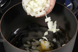Refogue a cebola em uma colher (sopa) de manteiga. Quando ela estiver transparente, coloque o arroz. Refogue um pouco e acrescente o vinho branco. Espere o vinho evaporar e vá colocando o caldo de legumes aos poucos, mexendo o risoto.
