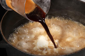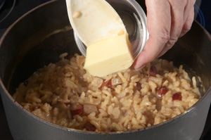 A quantidade de caldo para o risoto ficar al dente nem sempre é precisa – é necessário experimentar e ver se o arroz já perdeu a transparência. Quando estiver quase al dente, acrescente o creme de leite, o café e os pinhões.